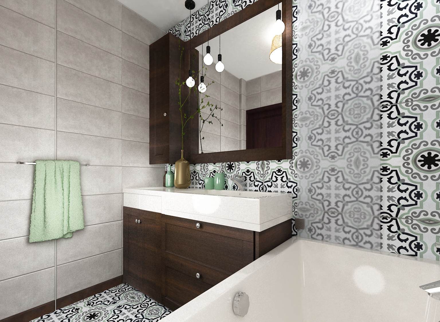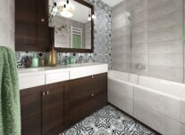 - łazienka – niepowtarzalne, ręcznie wykonane płytki cementowe Juanito – Kolory Maroka skomponowane z neutralnymi szarymi płytkami