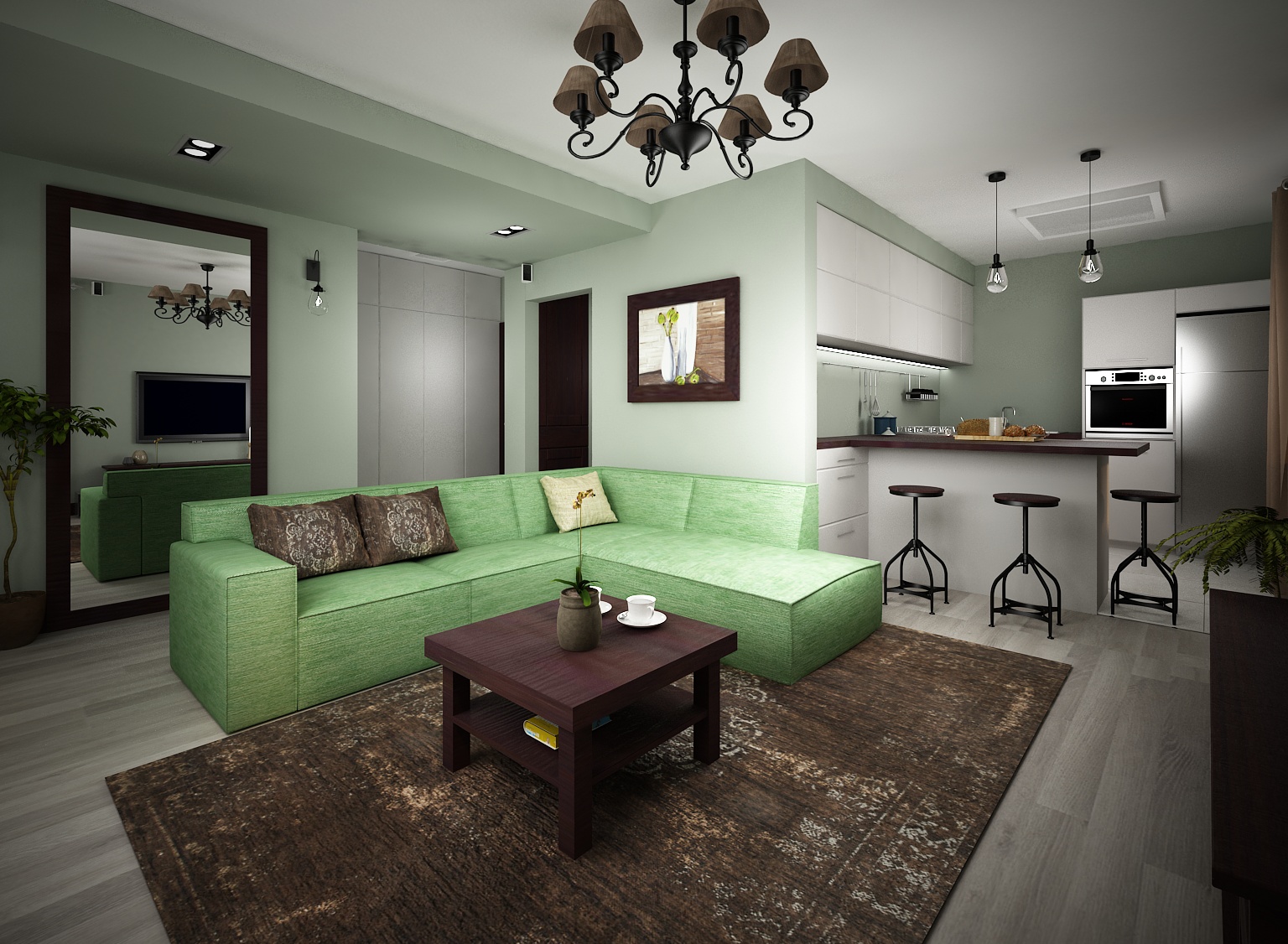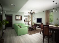 Na początku były ciemne drewniane meble… ukochane przez domowników sporego mieszkania we Włochach. To one narzuciły kolonialny klimat wnętrza – w bardzo nowoczesnej i wyrafinowanej odsłonie. Składa się na nią paleta wykorzystanych barw, materiały zastosowane do wykończenia podłóg i ścian, a także meble i drobne detale, które razem budują wyjątkowy nastrój. Dominują tu kolory ziemi, takie jak brązy czy różne odcienie zieleni i beżu, z dodatkiem monochromatycznej szarości. Meble kolonialne, dzięki swej prostocie i małej ilości zdobień są w doskonałej harmonii z nowoczesnym wyposażeniem – jakże efektowną modną pistacjową kanapą, czy białymi prostymi szafami i meblami kuchennymi. Meble, ramy obrazów i luster zostały wyeksponowane na tle szarej drewnianej podłogi oraz ścian o delikatnej szarozielonej barwie. Dopełnieniem są szlachetne beżowo-złote tkaniny, orientalny wzorzysty brązowy dywan, duże lustra i dyskretne oświetlenie. Jedynym charakterystycznym elementem świetlnym jest stylizowany żyrandol zawieszony w centralnej części nad strefą wypoczynkową. Została ona wydzielona dzięki obniżeniu sufitu w strefie komunikacyjnej. Przestronne, otwarte wnętrze, uporządkowane poprzez wyraźny podział na poszczególne funkcje, a także spójność i jednolitość zastosowanych materiałów sprawiają, że przestrzeń jest bardzo przytulna i klimatyczna, tworząc prawdziwą oazę spokoju…miejsce idealne do odpoczynku po całym dniu pracy.