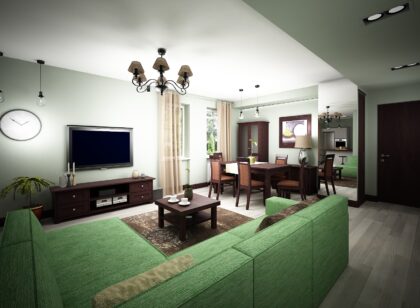 - meble w salonie i jadalni – ciemne drewno, wenge